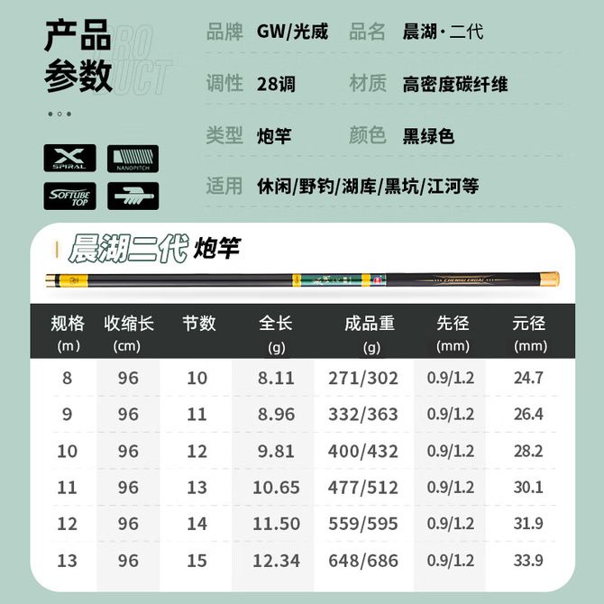 光威鱼竿长竿8米晨湖二代28调超轻超硬炮竿传统钓手竿打窝竿鱼杆野钓综合竿钓鱼竿渔具