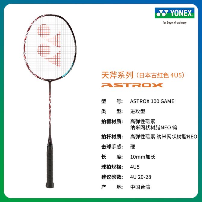 尤尼克斯(YONEX)天斧系列 ASTROX 100 GAME yy 羽毛球拍 日本古红色4U(约83g)G5 穿好线,送原装拍套,更强的扣杀。 兑换价格 38300 里程 会员卡别 终身白金卡 白金卡 金卡 银卡 普通卡 儿童卡 商品已下架 1. 请联系卖家咨询 2. 逛逛小雅运动选择其他商品 组合销售 产品介绍 产品规格 售后服务 产品咨询 发现好货 川崎/KAWASAKI 羽毛球双拍超轻男女羽毛球对拍入门级训练双拍 IRON-007 8700 里程 威克多(Victor) 羽毛球拍对拍 碳素初学入门级户外运动轻量耐用对拍套装 +3只球 7400 里程 创悦(CREAJOY)健腹轮 双轮健腹器健身轮 家用健身俯卧撑轮 CY-9061 1700 里程 佑美 无绳计数跳绳减肥运动专用燃脂硅胶大球无绳款 TS50蓝色 3100 里程 佑美 泡棉无绳大球跳绳海绵手柄舒适防滑TS14粉色 1700 里程