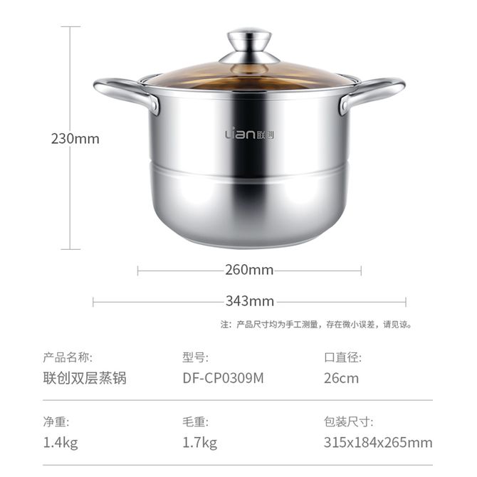 联创(Lian)双层蒸锅 26cm 不锈钢蒸锅汤锅蒸汤锅DF-CP0309M