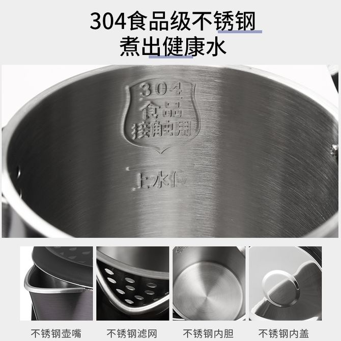 1、彩钢外壳:加厚彩钢,双层防烫 2、卷边壶嘴:彩钢一体成型,防割手 3、无缝内胆:.35mm加厚内胆 ,食品级304 4、家泰温控:防水温控,一键保温 全新pp塑料 5、自动弹盖‘下开关、国标电源线