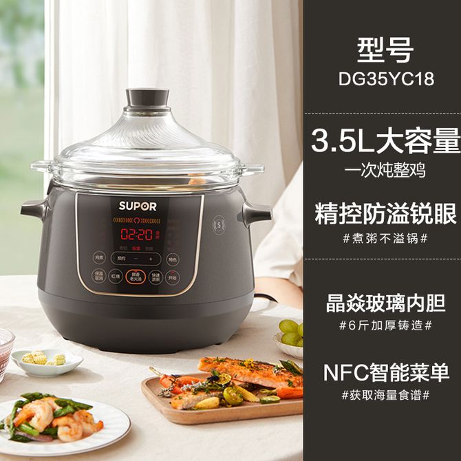 苏泊尔(SUPOR)电炖锅 电炖盅 煲汤锅炖汤锅 煮粥锅 燕窝炖锅 可预约 NFC智能菜单 远红外电炖锅 DG35-YC18 3.5升容量 800W功率 ,远红外穿透加热,晶焱玻璃内胆,NFC智能食谱 兑换价格 30400 里程 会员卡别 终身白金卡 白金卡 金卡 银卡 普通卡 儿童卡 商品已下架 1. 请联系卖家咨询 2. 逛逛北京致诚博雅贸易有限公司选择其他商品 组合销售 产品介绍 产品规格 售后服务 产品咨询 发现好货 小熊/Bear 电炖锅1-2人小炖锅煮粥锅智能预约定时煲汤锅炖汤锅燕窝炖盅 4400 里程 苏泊尔(SUPOR) 电火锅家用不粘煎涮炖煮多功能4L大容量一体式大火力电煮锅不粘煎涮炖煮多功能料理锅 H40YK757 5700 里程 西屋/Westinghouse 多功能电煮锅电炖锅1.6L一锅多能WFB16A 11600 里程 苏泊尔(SUPOR) 电火锅 宿舍小电锅学生寝室一体泡面小火锅 多功能锅涮肉涮菜 1.7L 【 单锅】H17YK489 3000 里程 小熊(Bear)电炖锅电炖盅煮粥神器煲汤锅炖汤锅婴儿煮粥锅熬粥燕窝炖盅DDG-E15K2 4800 里程