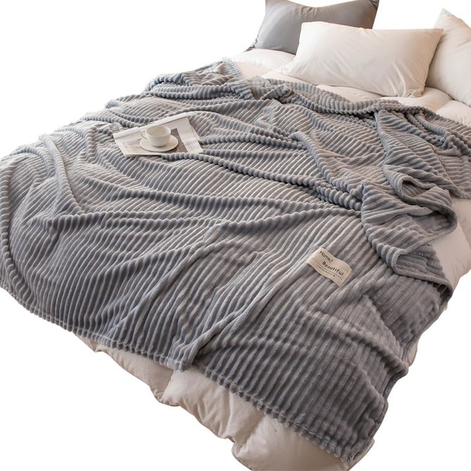 (银灰)150*200cm;亲肤牛奶绒是一种绒面的(棉)毛织物。条形设计柔感亲肤。成品面料的绒面非常的厚实,手感柔软,绒面细腻夏天可以当作盖被,冬秋天可作床单,直接与肌肤接触;面料:亲肤牛奶绒(聚酯纤维)