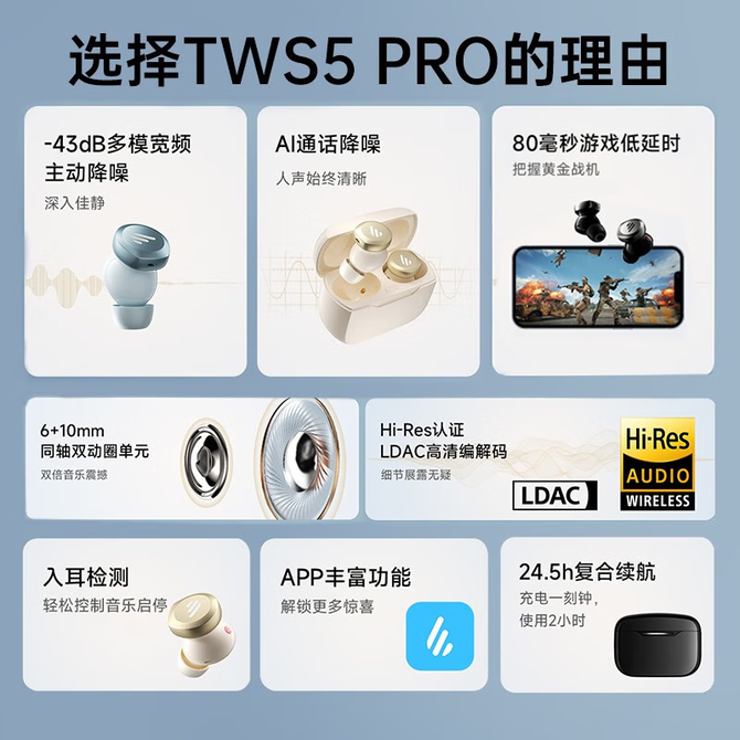 漫步者(EDIFIER) 真无线双动圈主动降噪蓝牙耳机TWS5 Pro雅黑 多模宽频降噪金标认证手机HIFI音乐耳塞 宽频降噪新旗舰丨Hi-Res金标好音质丨同轴双动圈开阔声场丨为降噪而生的高音质耳机,同轴双动圈单元,体验双倍快乐,Hi-Res金标认证音质,细节展露无疑,-43dB多模宽频降噪! 兑换价格 17000 里程 会员卡别 终身白金卡 白金卡 金卡 银卡 普通卡 儿童卡 商品已下架 1. 请联系卖家咨询 2. 逛逛智科精品选择其他商品 组合销售 产品介绍 产品规格 售后服务 产品咨询 发现好货 雷摄 运动蓝牙耳机无线跑步超长续航待机半入耳降噪高端健身2024新款 BT-03半入耳 1400 里程 华为/Huawei FreeBuds SE 3 无线蓝牙耳机 流光金 6100 里程 纽曼 LY63蓝牙耳机耳夹式骨传导概念开放式不入耳无线运动音乐通话降噪 3400 里程 纽曼(Newmine) 夹耳式蓝牙耳机 超无感佩戴空气感舒适体验 LY63 3400 里程 飞利浦(PHILIPS) 骨传导通话降噪耳夹式真无线开放耳机TAT3469 7000 里程