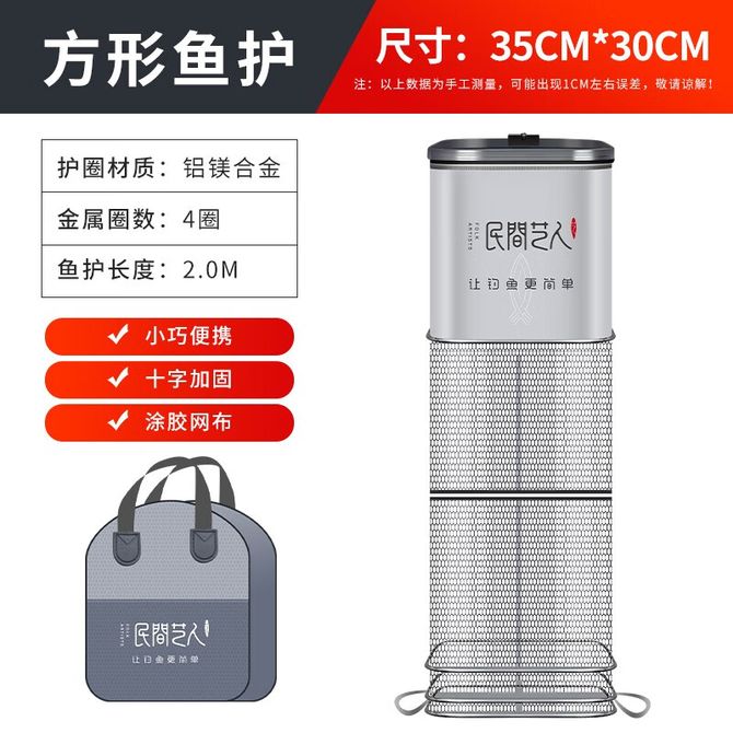 民间艺人 方形鱼护涂胶防挂速干渔护钓鱼网袋钢圈加固鱼护网兜 方形鱼护35x30*2米+档针+包