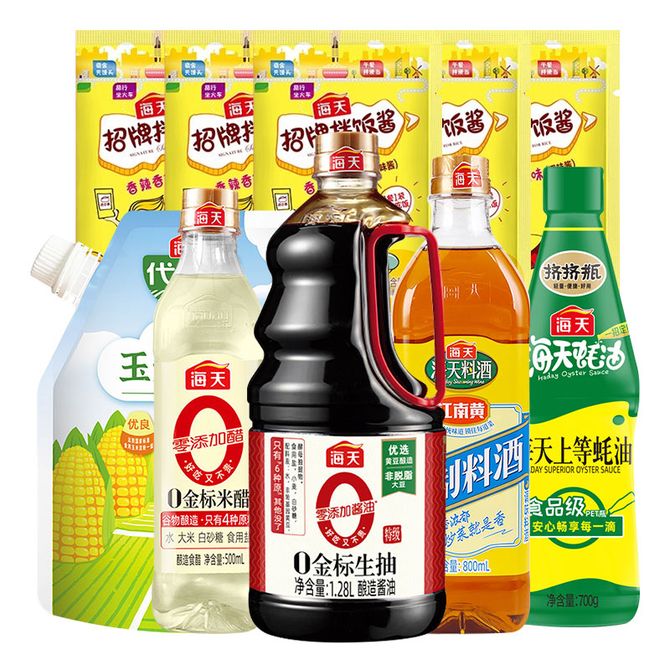 海天 0金标生抽1.28L+0金标米醋500ml+精制料酒800ml+上等蚝油700g+玉米淀粉200g+招牌拌饭酱20g*5调味组合(调料调味品)