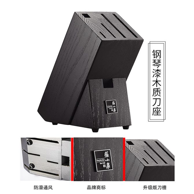 "1:刀体采用50CR15MOV精良钢材,碳、铬、钼、钡等有效金属比例合理,分布均匀,结构紧密,兼具硬度和税利。2:人体流线型手柄设计,流畅弧线,舒适手感,使用时紧密贴合双手,亲切如握手。3:张字标志。手柄尾端镶嵌张小泉中汉字“张”字。4:钢棽漆木质刀座。"