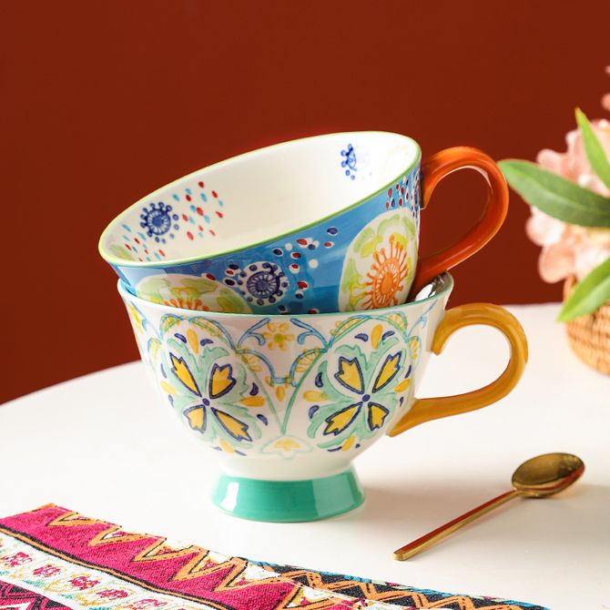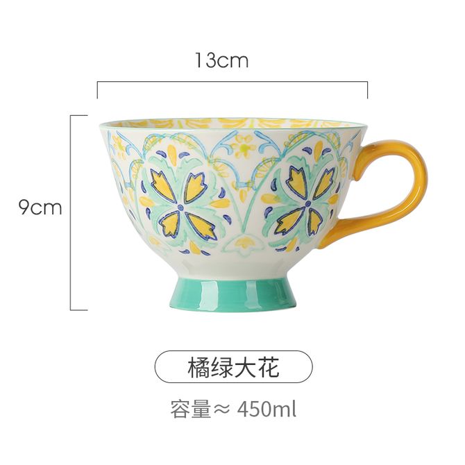 居图陶瓷高颜值马克杯早餐杯复古民族风450ml橘绿大花单个装