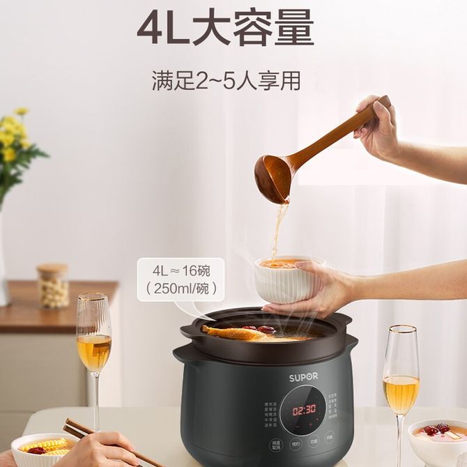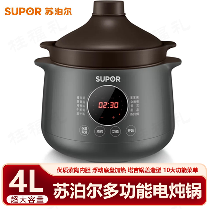 苏泊尔(SUPOR) 电炖锅 4L多功能家用电炖盅 可预约炖汤锅 热水快炖煲汤锅煮粥锅 紫陶内胆 DG40YC36 优质紫陶内胆,浮动底盘加热,塔吉锅盖造型,贴心热水快炖,防烫锅体设计,10大功能菜单 兑换价格 13000 里程 会员卡别 终身白金卡 白金卡 金卡 银卡 普通卡 儿童卡 服务 由 广西桂福礼供应链管理有限公司 发货并提供售后 颜色: 其他 购买数量: 件 库存件 配送地址: 立即购买 加入购物车 成功添加到购物车 关闭 购物车共有 种商品 总金额为: 组合销售 产品介绍 产品规格 售后服务 产品咨询 发现好货 小熊/Bear 电炖锅1-2人小炖锅煮粥锅智能预约定时煲汤锅炖汤锅燕窝炖盅 4400 里程 苏泊尔(SUPOR) 电火锅家用不粘煎涮炖煮多功能4L大容量一体式大火力电煮锅不粘煎涮炖煮多功能料理锅 H40YK757 5700 里程 西屋/Westinghouse 多功能电煮锅电炖锅1.6L一锅多能WFB16A 11600 里程 苏泊尔(SUPOR) 电火锅 宿舍小电锅学生寝室一体泡面小火锅 多功能锅涮肉涮菜 1.7L 【 单锅】H17YK489 3000 里程 小熊(Bear)电炖锅电炖盅煮粥神器煲汤锅炖汤锅婴儿煮粥锅熬粥燕窝炖盅DDG-E15K2 4800 里程