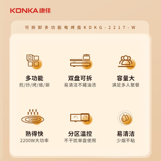 康佳/Konka 电烧烤炉2200W 烤肉锅 多功能电火锅涮烤一体锅家用电烤炉烤涮锅 双温控可分离 KDKG2217W 多功能煎/炒/烤/烙/涮,双盘可拆易清洁不藏油渍,熟得快2200W大功率,易清洁少烟不粘 兑换价格 12200 里程 会员卡别 终身白金卡 白金卡 金卡 银卡 普通卡 儿童卡 商品已下架 1. 请联系卖家咨询 2. 逛逛广西桂福礼供应链管理有限公司选择其他商品 组合销售 产品介绍 产品规格 售后服务 产品咨询 发现好货 苏泊尔(SUPOR)空气炸锅 家用多功能4.2L大容量 烤箱薯条机 无油烟电炸锅 大功率 无油低脂煎炸锅KJ42D811 7800 里程 美的/Midea 空气炸锅 家用5升可视炸锅金属内腔体微蒸汽多功能智能双旋控温电炸锅 KZE5089 10900 里程 奥克斯/AUX 空气炸锅5L电炸锅多功能大容量无油电炸锅空气炸锅机械款 4.5L 机械款 AUX-3002M 复古绿 6500 里程 奥克斯 电火锅 电炒锅 电煮锅 火锅锅 电锅一体锅 家用多功能料理烤肉电热锅 多用途锅大容量 无笼款 5L 4800 里程 苏泊尔(SUPOR)多功能锅料理锅电火锅多用途电煮锅不粘电热锅家用电炒锅方形烤盘煎烤锅JD3424D08-150 YL 13000 里程