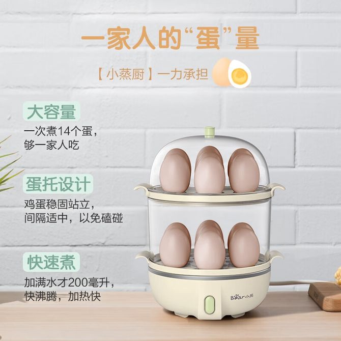 组合销售 产品介绍 产品规格 售后服务 产品咨询 发现好货 小熊/Bear 煮蛋器 蒸蛋器 单双层家用多功能高温保护早餐鸡蛋羹迷你电蒸锅 ZDQ-D12R3 2000 里程 小熊/Bear 蒸蛋器 ZDQ-D12R3 暖灰色 煮蛋器多功能家用小型双层非自动断电煮蛋神器 2900 里程 小熊/Bear 煮蛋器蒸蛋器单双层家用高温断电迷你早餐鸡蛋羹蒸鸡蛋器蒸蛋机炖蛋器便携式电蒸锅ZDQ-B14Q1 2200 里程 小熊/Bear 煮蛋器蒸蛋器单双层家用高温断电迷你早餐器蒸蛋机炖蛋器蒸蛋锅便携式电蒸锅ZDQ-B14Q1带不锈钢蒸碗 2600 里程 小熊/Bear 煮蛋器 小型家用可定时不锈钢蒸蛋器自动断鸡蛋羹迷你电蒸锅ZDQB07C3 3500 里程