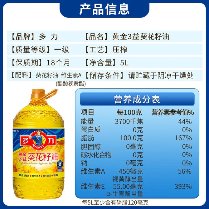 多力/Mighty 食用油 黄金3益葵花籽油 5L