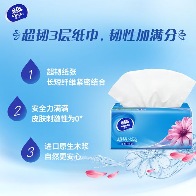 维达 超韧抽纸3层150抽*24包 家庭囤货8提装 家用软抽餐巾纸面巾纸擦手纸 湿水不易破卫生纸巾抽取式纸面巾 【新旧包装随机发货】湿水不易破 兑换价格 5700 里程 会员卡别 终身白金卡 白金卡 金卡 银卡 普通卡 儿童卡 服务 由 京狮文化生活馆 发货并提供售后 包装数量: 8提 购买数量: 件 库存件 配送地址: 立即购买 加入购物车 成功添加到购物车 关闭 购物车共有 种商品 总金额为: 组合销售 产品介绍 产品规格 售后服务 产品咨询 发现好货 维达卷纸 卫生纸实惠装厕纸家用厕所纸巾手纸整箱批有芯大卷家庭装 1200-2300 里程 维达 Vinda 卷纸 140g/卷*10卷 蓝色经典3层卫生纸 1300 里程 心相印抽纸 茶语丝享系列 量贩家庭装 3层*100抽*4包(茶香 压花) 1100 里程 心相印 经典系列 二层面巾纸 180抽*6包*1提 1100 里程 维达Vinda 超韧系列抽纸(3层*130抽*6包) 原生木浆卫生餐巾纸婴儿面巾纸 6包优惠装 1100 里程
