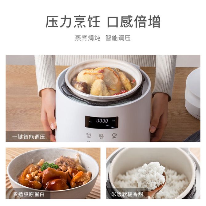 组合销售 产品介绍 产品规格 售后服务 产品咨询 发现好货 苏泊尔(SUPOR)电压力锅 6升大容量 智能触控 球釜双胆 开盖收汁 一键排压 SY-60YC8001Q 高压锅 16900 里程 苏泊尔(SUPOR) 5L电压力锅家用电高压锅双胆高压电饭锅煮饭智能预约 SY-50YC8186 11300 里程 美的/Midea 电压力锅 【一锅双胆】5L全自动家用智能预约 上蒸下煮 不粘双胆煲汤炖肉 YL50Q3-451 10900 里程 美的/Midea 电压力锅 【双胆】5升大容量电饭煲全自动智能饭锅多功能高压锅 24小时智能预约 MY-E523 10400 里程 九阳/Joyoung 电压力锅5L家用电饭锅压力煲电高压锅煮饭锅电饭锅电饭煲全自动智能预约 Y-50C31 11000 里程