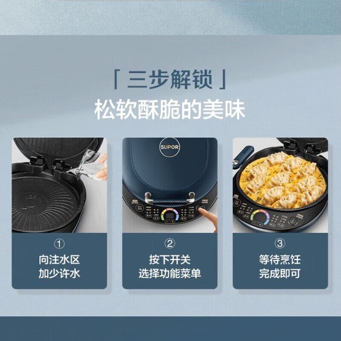 组合销售 产品介绍 产品规格 售后服务 产品咨询 发现好货 苏泊尔(SUPOR)电饼铛家用 双面加热煎饼铛煎烤机三明治机烙饼锅早餐机25mm加深烤盘火力可调JD31A847A 6500 里程 苏泊尔(SUPOR) 电饼铛 自动煎烤机 电火锅多功能 加大加深60mm双加热烙饼 锅面煎饼电饼档 两档火力 JT30A818 5700 里程 苏泊尔(SUPOR)电饼铛家用双面加热电饼档煎烤机烙饼机双面悬浮加热早餐机三明治机JJ30A648-Q 5700 里程 美的(Midea)电饼铛家用智能双面加热煎烤机烙饼机蛋饼机薄饼机煎饼烙饼锅JHN30F 4800 里程 奥克斯 电饼铛家庭用新款双面加热加大尺寸加深烤盘烙饼专用锅自动控温断电煎饼锅早餐机 5200 里程