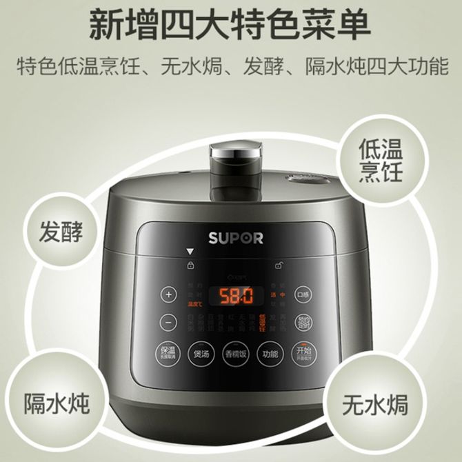 组合销售 产品介绍 产品规格 售后服务 产品咨询 发现好货 苏泊尔(SUPOR)电压力锅 6升大容量 智能触控 球釜双胆 开盖收汁 一键排压 SY-60YC8001Q 高压锅 16900 里程 美的/Midea 电压力锅家用5L大容量多功能高压锅双胆一键收汁智能预约不粘电高压锅电饭锅煮粥煲汤锅 一锅双胆【一键收汁入味】 YL50M1-702 10600 里程 苏泊尔(SUPOR) 5L电压力锅家用电高压锅双胆高压电饭锅煮饭智能预约 SY-50YC8186 11300 里程 美的/Midea 电压力锅 【一锅双胆】5L全自动家用智能预约 上蒸下煮 不粘双胆煲汤炖肉 YL50Q3-451 10900 里程 美的/Midea 电压力锅 高压锅家用电压力煲智能预约电饭煲大容量多功能定时预约电饭煲3-8人单胆旋钮款4L MY-E4809 8700 里程