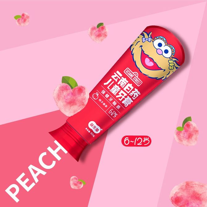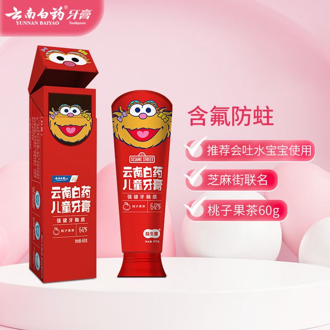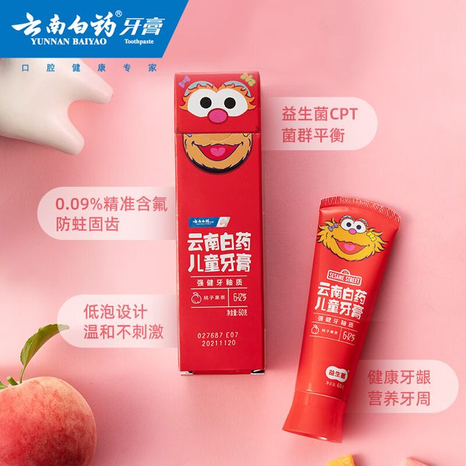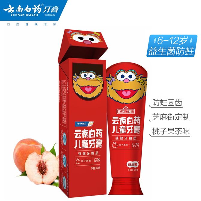 云南白药 益生菌儿童牙膏桃子果茶(6-12岁)60g 单支装 芝麻街IP联名 含氟防蛀固齿强健牙釉质儿童牙膏 桃子味