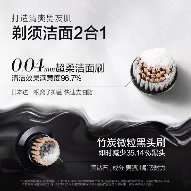 剃须+洁面+去黑头,多面清洁;超柔浓密洁面刷,体验轻柔感洁面;微米级竹炭微粒黑头刷,清爽祛黑头;Air Cushion气垫减震专利,双环刀网;智能LED显示屏;全身防水,大理石纹理,每一支都无法复刻