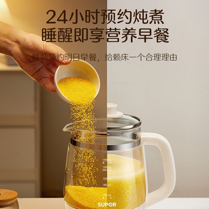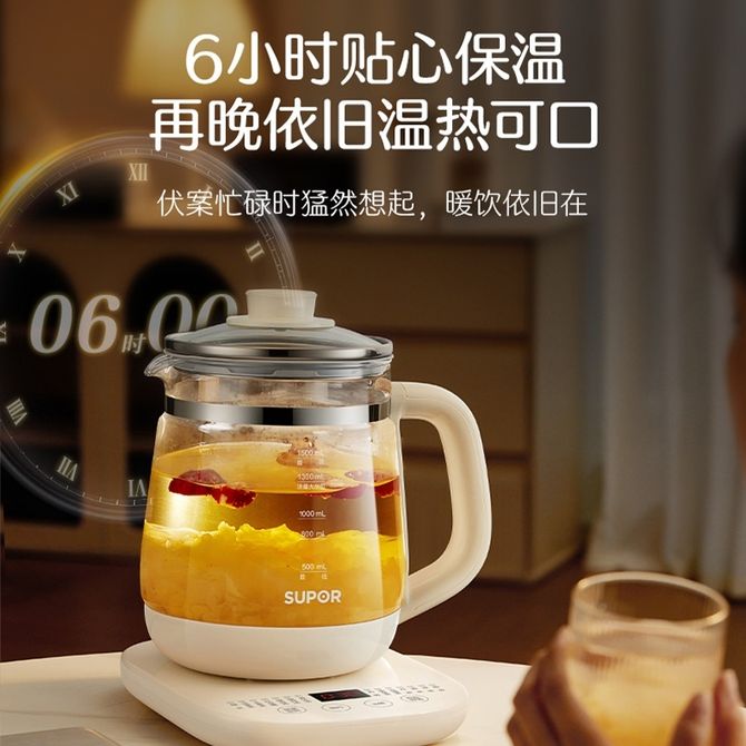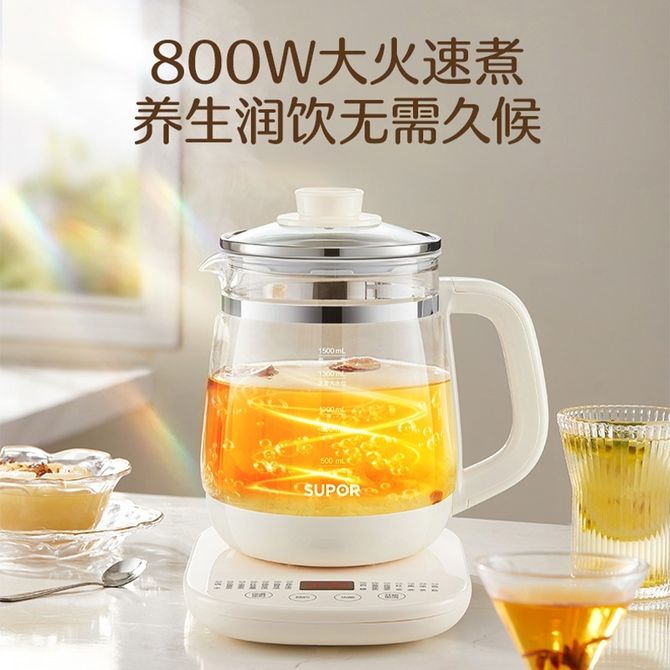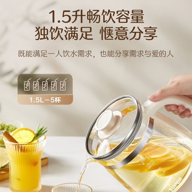 苏泊尔/Supor 养生壶大容量煮茶器花茶壶恒温水壶烧水壶电热水壶办公室保温煮茶壶 高硼硅玻璃 分体式设计 316L不锈钢滤网/发热盘 14大养生功能 兑换价格 6500 里程 会员卡别 终身白金卡 白金卡 金卡 银卡 普通卡 儿童卡 服务 由 北京致诚博雅贸易有限公司 发货并提供售后 颜色: 米白 购买数量: 件 库存件 配送地址: 立即购买 加入购物车 成功添加到购物车 关闭 购物车共有 种商品 总金额为: 组合销售 产品介绍 产品规格 售后服务 产品咨询 发现好货 九阳/Joyoung 养生壶1.5L茶具电茶壶煮茶壶花茶壶玻璃煮茶器煎药壶中药锅药膳电水壶烧水壶 3900 里程 九阳/Joyoung 养生壶迷你玻璃花茶壶煮茶器 12大功能11档温度 电水壶热水壶烧水壶 1.5L DGD1506BQ 3900 里程 美的/Midea 养生壶 1.5L家用多功能小型全自动办公室烧水壶加厚玻璃煮茶热水壶 MK-YS15P201 4200 里程 美的/Midea 养生壶 1.5L家用养生壶全自动玻璃烧水壶24h预约烧水壶12小时防干烧保护智能恒温 MK-YS15P202 3700 里程 美的/Midea 养生壶 1.5L全自动电热水壶 24h预约12小时智能恒温 14大功能11档控温 花茶壶煮茶器MK-Y12Q 3500 里程