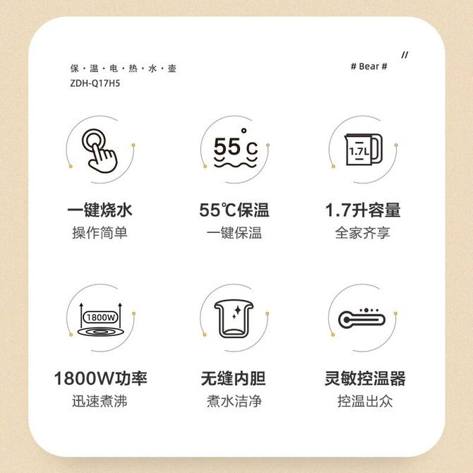 小熊/Bear 电水壶1.7L家用电热水壶304不锈钢烧水壶双层保温防烫55C恒温开水壶 1800W功率,304不锈钢,无缝内胆,一键烧水操作简单,55℃保温 一键保温。 兑换价格 3900 里程 会员卡别 终身白金卡 白金卡 金卡 银卡 普通卡 儿童卡 服务 由 广西桂福礼供应链管理有限公司 发货并提供售后 颜色: 其他 购买数量: 件 库存件 配送地址: 立即购买 加入购物车 成功添加到购物车 关闭 购物车共有 种商品 总金额为: 组合销售 产品介绍 产品规格 售后服务 产品咨询 发现好货 苏泊尔(SUPOR)电水壶 1.7L 不锈钢/YL SW-17S13A 5700 里程 志高/Chigo 电水壶烧水壶1.8L大容量电热水壶双层防烫自动断电家用烧水开水壶不锈钢 电水壶 DC-A18F 1900 里程 美的/Midea 电热水壶家用大容量烧水壶热水壶双层防烫电水壶304不锈钢内胆自动断电分离式拔盖 MK-SH15X1-102 3000 里程 小熊/Bear 电水壶家用烧水壶 不锈钢自动断电恒温热水壶保温一体电热水壶1.5L容量 3500 里程 小熊/Bear 烧水壶电水壶热水壶电热水壶开水壶304不锈钢内胆双层防烫1.5L大容量ZDH-Q15U8 3000 里程
