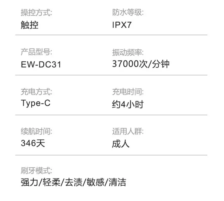 松下/Panasonic 电动牙刷牙医推荐成人情侣款5种模式去渍护龈滑动解锁科技EW-DC31-W405 5种模式去渍护龈 兑换价格 23000 里程 会员卡别 终身白金卡 白金卡 金卡 银卡 普通卡 儿童卡 服务 由 当益家电 发货并提供售后 颜色: 白色 购买数量: 件 库存99件 配送地址: 立即购买 加入购物车 成功添加到购物车 关闭 购物车共有 种商品 总金额为: 组合销售 产品介绍 产品规格 售后服务 产品咨询 品牌:松下/Panasonic 收藏商家 发现好货 小米 声波电动牙刷家用男女高频振动充电式防水牙刷 T300标准版 4400 里程 京东京造 冲牙器 家用立式洗牙器洁牙器水牙线 洗牙神器 JZCY-06B 6500 里程 港德 电动便携冲牙器 水牙线 豪华款4个喷嘴 200ml大容量水箱 RD-A76-4 3400 里程 飞利浦/Philips 电动牙刷头HX9021适配HX6511/HX6730/HX6761/HX3226/ 2400 里程 小米 米家声波电动牙刷 声波洁牙柔感护龈 超长续航 T200蓝色 4400 里程