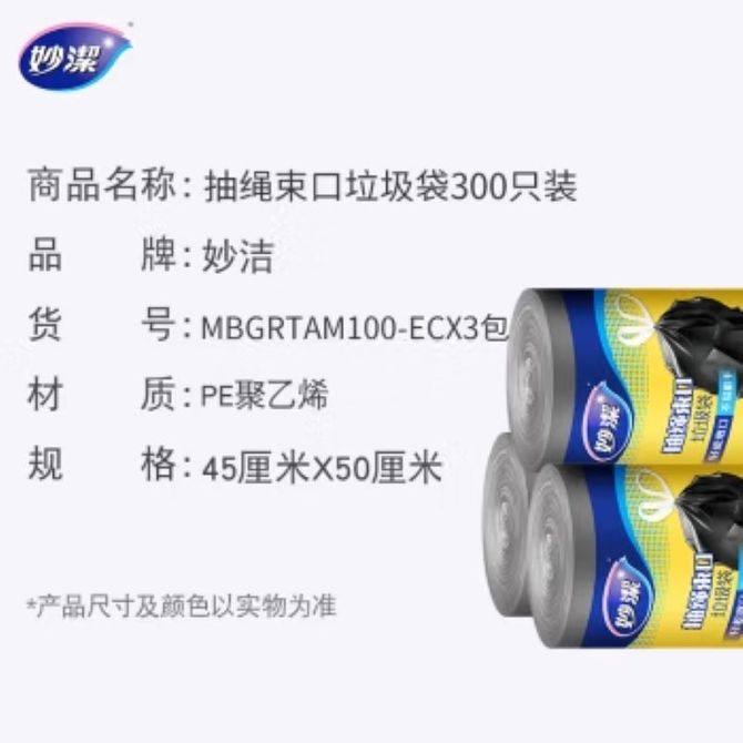 妙洁 妙洁 抽绳束口垃圾袋 中号垃圾袋300只 加厚手提式垃圾袋 厨余家用干湿分类 轻松束口 不易脏手 省时省力 方便卫生 兑换价格 3900 里程 会员卡别 终身白金卡 白金卡 金卡 银卡 普通卡 儿童卡 服务 由 百宝诚 发货并提供售后 颜色: 黑色 购买数量: 件 库存件 配送地址: 立即购买 加入购物车 成功添加到购物车 关闭 购物车共有 种商品 总金额为: