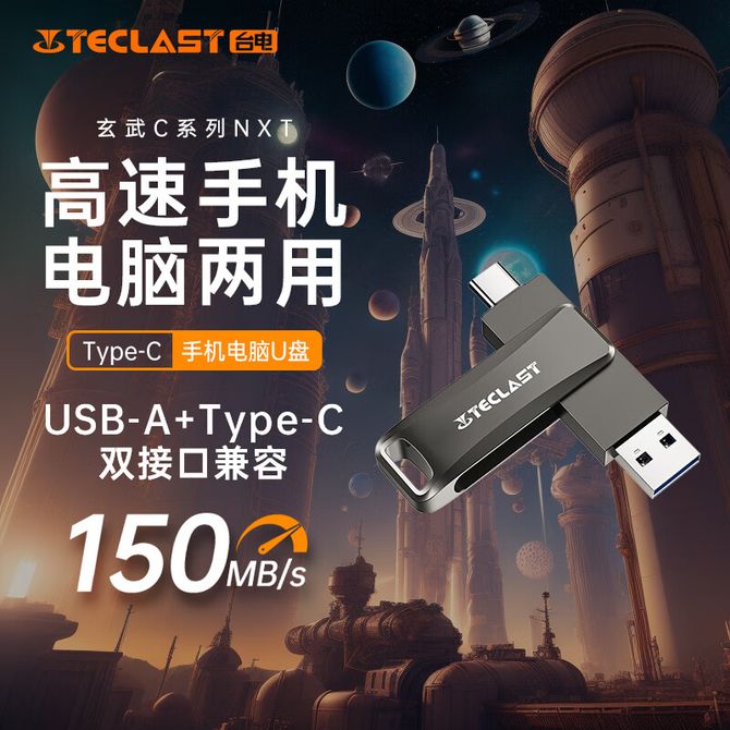 手机电脑两用,Type-C和USB3.2双接口高速U盘,合金机身便携耐用,360°旋转保护盖,传输速度高达150MB/s,多设备兼容