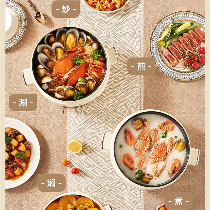 4L容量;食品级不粘涂层,轻烟少油易清洁;拔杆调控,三档火力随意调节;深锅大容量,轻松制作大份美食;一锅多能,蒸煮焖炖涮样样精通;双边防烫把手,防干烧断电保护;360℃环式发热,导热均匀不夹生