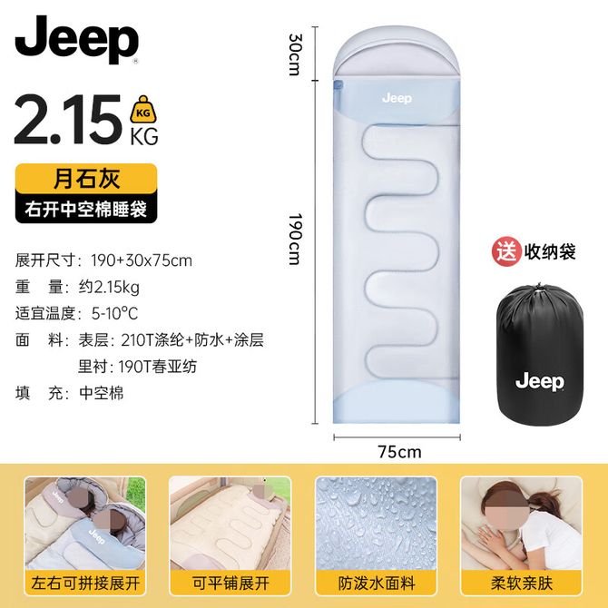 Jeep 户外露营可拼接便携信封式睡袋 2.15kg右开(两色可选) 2.15kg右开、舒适温度5~10°C(适合冬季使用) 兑换价格 4700 里程 会员卡别 终身白金卡 白金卡 金卡 银卡 普通卡 儿童卡 服务 由 至恩户外运动专营店 发货并提供售后 颜色: 灰色 卡其色 购买数量: 件 库存件 配送地址: 立即购买 加入购物车 成功添加到购物车 关闭 购物车共有 种商品 总金额为: