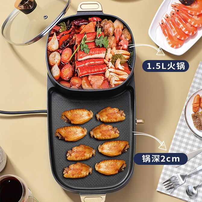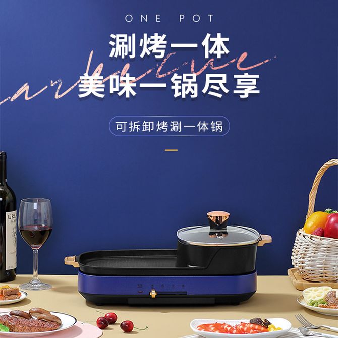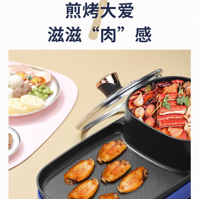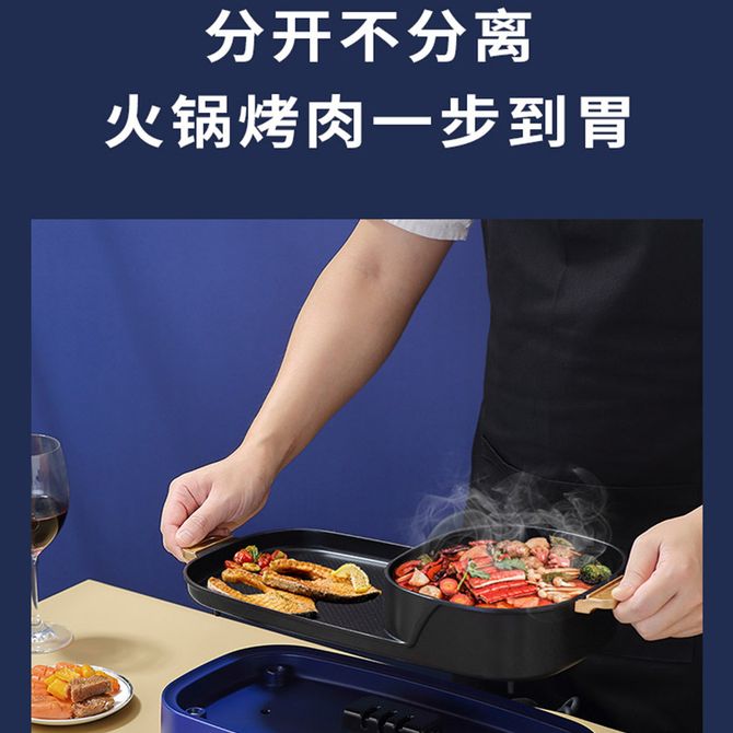 1.5L容量;可拆卸烤涮一体锅,无需搬动整机,清洗更轻松;拨杆温控,根据不同食材所需的温度更好调控;锅体使用优质铝材,压铸一体成型,传热迅速均匀;烤盘表面溶射不粘涂层,煎、烤、涮好周到,易清洗,少油烟。