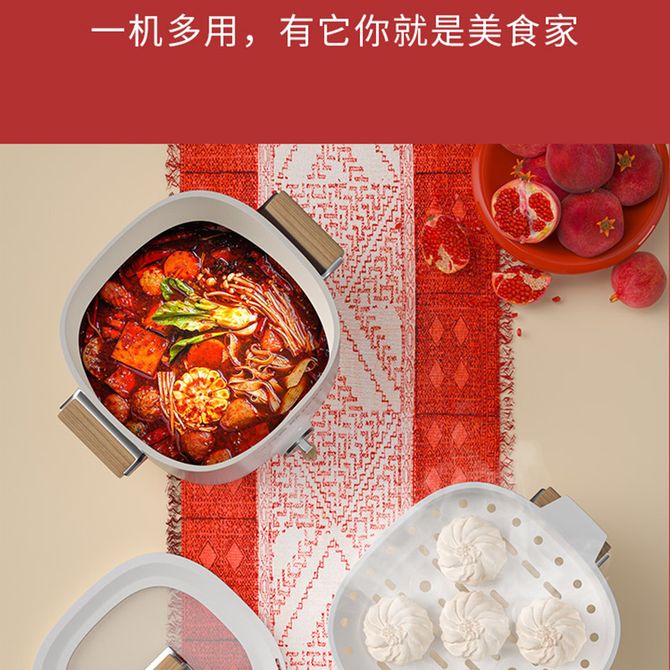 2.5L精致容量;蒸、煮、炒、涮、煎,一锅解锁;搭配蒸笼,上蒸下煮,同时搞定两种美食;内胆食品级不粘涂层,不易粘锅,好清洗;1000W功率,受热均匀,快速升温;大小火候调节,美味轻松掌控