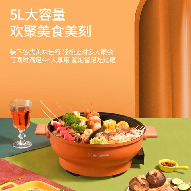 西屋/Westinghouse 电火锅 鸳鸯锅多功能烤涮一体锅5L大容量料理锅 1500W大功率 5L大容量,1500W大火力;不粘工艺 兑换价格 10000 里程 会员卡别 终身白金卡 白金卡 金卡 银卡 普通卡 儿童卡 服务 由 广西自贸区京通桂达科技发展有限公司 发货并提供售后 颜色: 橙色 购买数量: 件 库存件 配送地址: 立即购买 加入购物车 成功添加到购物车 关闭 购物车共有 种商品 总金额为: 组合销售 产品介绍 产品规格 售后服务 产品咨询 发现好货 苏泊尔(SUPOR)空气炸锅 家用多功能4.2L大容量 烤箱薯条机 无油烟电炸锅 大功率 无油低脂煎炸锅KJ42D811 7800 里程 美的/Midea 空气炸锅 家用5升可视炸锅金属内腔体微蒸汽多功能智能双旋控温电炸锅 KZE5089 10900 里程 奥克斯/AUX 空气炸锅5L电炸锅多功能大容量无油电炸锅空气炸锅机械款 4.5L 机械款 AUX-3002M 复古绿 6500 里程 奥克斯 电火锅 电炒锅 电煮锅 火锅锅 电锅一体锅 家用多功能料理烤肉电热锅 多用途锅大容量 无笼款 5L 4800 里程 苏泊尔(SUPOR)多功能锅料理锅电火锅多用途电煮锅不粘电热锅家用电炒锅方形烤盘煎烤锅JD3424D08-150 YL 13000 里程
