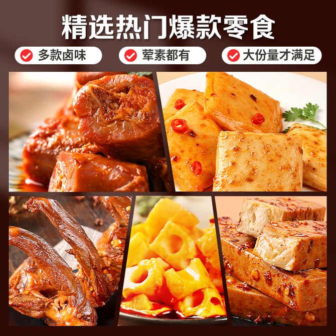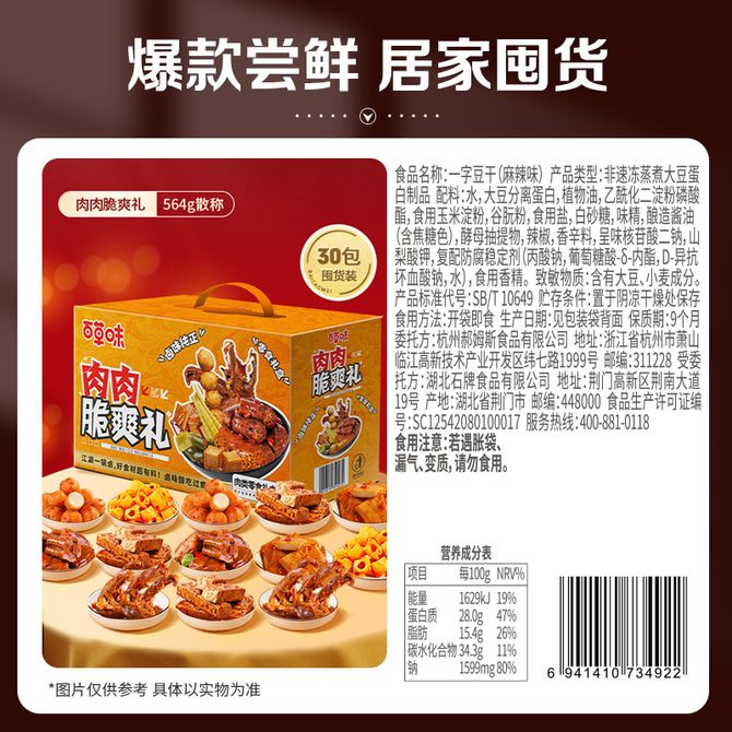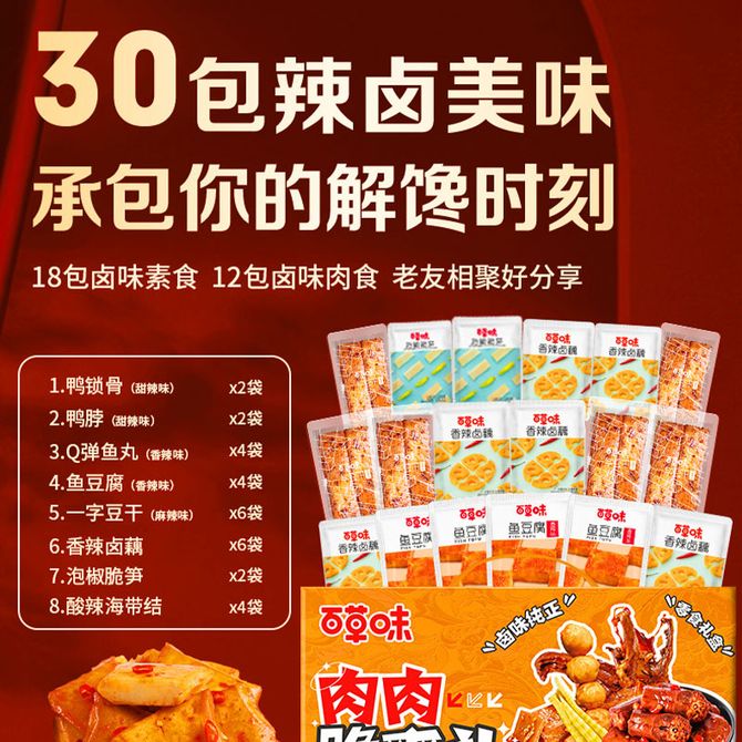配置:肉肉脆爽礼564g;内配:鸭锁骨(小包装)*2,鸭脖(小包装)*2,Q弹鱼丸(小包装)*4,鱼豆腐(小包装)*4,一字豆干(小包装)*6,香辣卤藕(小包装)*6,泡椒脆笋(小包装)*2 ,酸辣海带结(小包装)*4