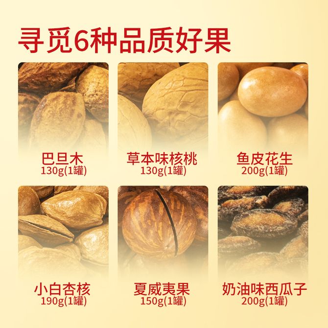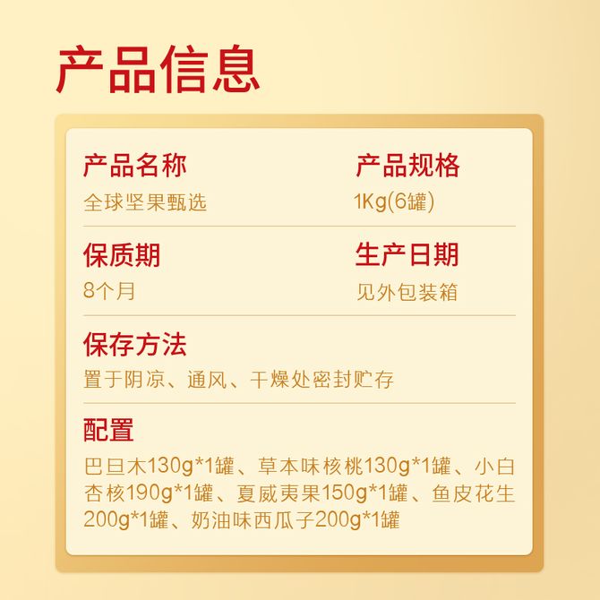 鲜记/xianjee 全球坚果臻选 1kg 休闲坚果零食 过年年货送礼大礼包 (全球坚果臻选1kg)全球坚果,寻觅好果,舌尖上的盛宴;遵循原香,仁厚饱满;当季原料,果肉饱满,外形匀整;产品配置:巴旦木130g,小白杏核190g,夏威夷果150g,草本味核桃130g,奶油西瓜子200g,鱼皮花生200g 兑换价格 3800 里程 会员卡别 终身白金卡 白金卡 金卡 银卡 普通卡 儿童卡 服务 由 铭钰食品专营 发货并提供售后 规格: 礼盒 购买数量: 件 库存件 配送地址: 立即购买 加入购物车 成功添加到购物车 关闭 购物车共有 种商品 总金额为: