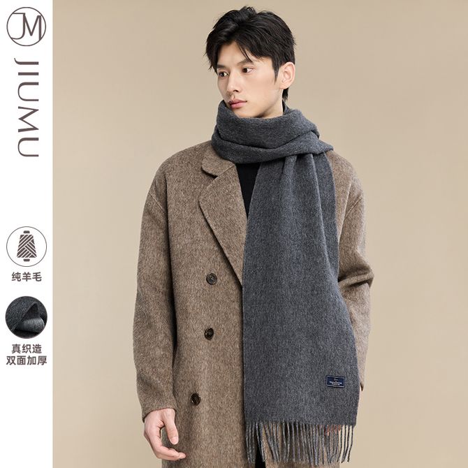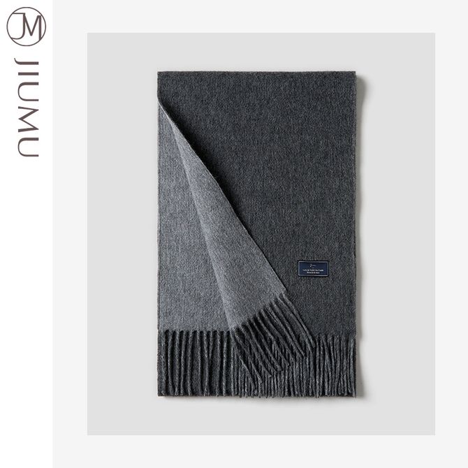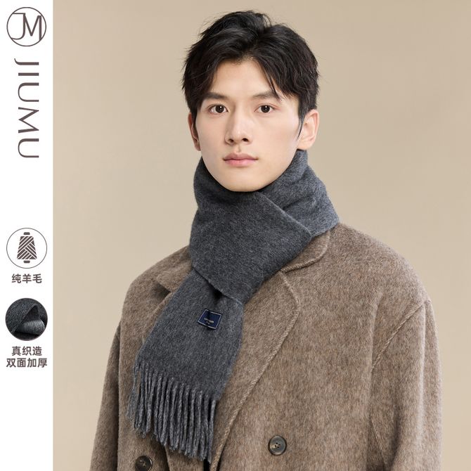 玖慕/JIUMU 男士纯羊毛围巾秋冬天保暖纯色高档送男友情侣百搭围脖礼盒 灰色