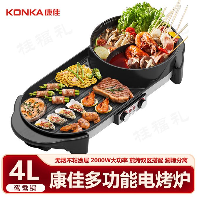 康佳/Konka 涮烤一体锅鸳鸯火锅电烧烤炉无烟电烤盘家用烤涮锅烤肉锅电烤炉双温控 4L大容量,涮烤一体,一锅多用,2200w功率,旋钮温控,无烟不粘 兑换价格 7800 里程 会员卡别 终身白金卡 白金卡 金卡 银卡 普通卡 儿童卡 服务 由 广西桂福礼供应链管理有限公司 发货并提供售后 颜色: 其他 购买数量: 件 库存件 配送地址: 立即购买 加入购物车 成功添加到购物车 关闭 购物车共有 种商品 总金额为: