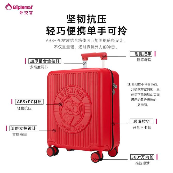 外交官/Diplomat 布布联名行李箱 短途登机箱 万向轮拉杆箱 17英寸 BB-L3303 基础款 红色 ABS+PC复合材质 360°顺滑万向轮 可调节伸缩拉杆 顺滑拉链 萌系拉链扣 兑换价格 15700 里程 会员卡别 终身白金卡 白金卡 金卡 银卡 普通卡 儿童卡 商品已下架 1. 请联系卖家咨询 2. 逛逛深圳市广聚元贸易有限公司选择其他商品 组合销售 产品介绍 产品规格 售后服务 产品咨询 发现好货 星迪威克-万向轮行李箱登机箱传统美学男女通用-750复古包角-20寸 5600 里程 恒源祥20寸网红拉杆箱行李箱拉链万向轮登机箱静音学生旅游潮流商务海关密码锁旅行箱HYX-2007 8000 里程 TYMON拉杆箱男女商务旅行登机箱TSA万向轮行李箱20英寸密码箱 黑色 幽兰丽影 12900 里程 皮尔卡丹/Pierre Cardin 20英寸简约时尚行李箱拉杆箱登机箱旅行箱密码箱子男女通用 5700 里程 旅行之家(Travelhouse)T1879 20寸全铝拉杆箱 轻盈耐磨万向轮登机箱行李箱 28900 里程