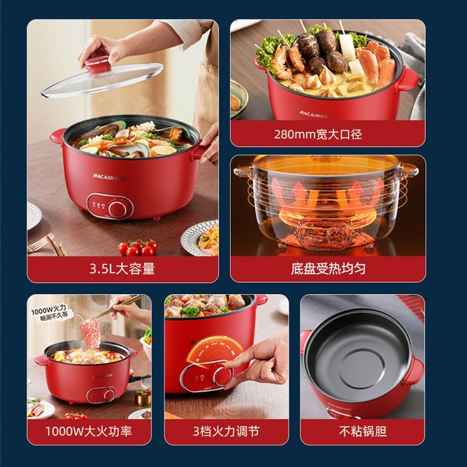MACAIIROOS 电煮锅 电火锅 3.5L容量小电锅电热锅多功能多用途锅煮煎炒锅泡面锅 3.5L大容量,底盘受热均匀,1000W大火功率,不粘锅胆,3档火力调节 兑换价格 4400 里程 会员卡别 终身白金卡 白金卡 金卡 银卡 普通卡 儿童卡 服务 由 广西自贸区京通桂达科技发展有限公司 发货并提供售后 颜色: 红色 购买数量: 件 库存件 配送地址: 立即购买 加入购物车 成功添加到购物车 关闭 购物车共有 种商品 总金额为: 组合销售 产品介绍 产品规格 售后服务 产品咨询 发现好货 苏泊尔(SUPOR)空气炸锅 家用多功能4.2L大容量 烤箱薯条机 无油烟电炸锅 大功率 无油低脂煎炸锅KJ42D811 6500 里程 苏泊尔(SUPOR)空气炸锅家用3L大容量电炸锅 蒸汽嫩炸多功能无油烟煎炸薯条机烤箱KD30DQ815 21700 里程 美的/Midea 空气炸锅 可视 不用翻面 金属内腔 蒸汽嫩炸 三档烘烤风力 5L KZC5089 10700 里程 小熊/Bear 空气炸锅 4D漩烤不用翻面 全自动 5L实用大容量 可视 蒸汽嫩炸 控油脱脂 炸烤箱一体机 9100 里程 小熊/Bear 家用多功能锅电炒锅电火锅电煮锅电锅分体式C60J5 6500 里程