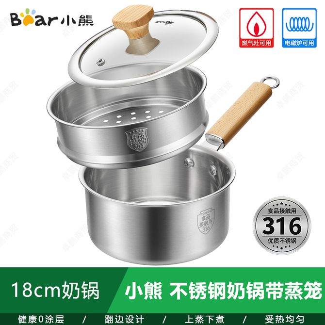 小熊 正品奶锅316不锈钢奶锅婴儿辅食锅18cm小锅加厚316L不锈钢(配蒸笼)CP-G0056-S03
