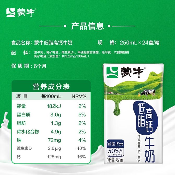 蒙牛 低脂高钙牛奶营养早餐奶250mL*24礼盒装 更低脂肪 轻松减负 兑换价格 3100 里程 会员卡别 终身白金卡 白金卡 金卡 银卡 普通卡 儿童卡 服务 由 致良优选 发货并提供售后 规格: 礼盒 购买数量: 件 库存件 配送地址: 立即购买 加入购物车 成功添加到购物车 关闭 购物车共有 种商品 总金额为: 组合销售 产品介绍 产品规格 售后服务 产品咨询 发现好货 蒙牛 特仑苏纯牛奶苗条装250ml×12盒 2900 里程 三元 经典小方白全脂纯牛奶250ml*24盒牛奶 整箱 3400 里程 伊利金典纯牛奶250ml*12盒整箱 2200 里程 伊利 金典纯牛奶整箱 250ml*12盒 3.6g乳蛋白 原生高钙 礼盒装 1800 里程 特仑苏 新日期纯牛奶250ml*12盒 3.6g乳蛋白 礼盒装 京东/顺丰发货 2400 里程