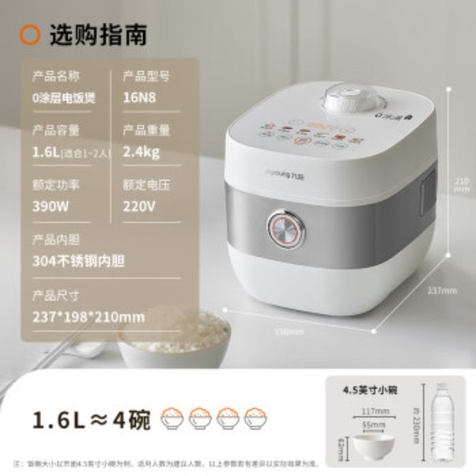 九阳/Joyoung 电饭煲16N8【0涂层】电饭煲电饭锅1.6升容量1-2人无涂层5A认证风冷水润膜304不锈钢内胆IH加热 【0涂层】电饭煲电饭锅1.6升容量1-2人无涂层5A认证风冷水润膜304不锈钢内胆IH加热 兑换价格 11200 里程 会员卡别 终身白金卡 白金卡 金卡 银卡 普通卡 儿童卡 服务 由 纳华优选 发货并提供售后 颜色: 米色 购买数量: 件 库存件 配送地址: 立即购买 加入购物车 成功添加到购物车 关闭 购物车共有 种商品 总金额为: 组合销售 产品介绍 产品规格 售后服务 产品咨询 发现好货 苏泊尔(SUPOR) 电饭煲电饭锅4L大容量 不粘内胆4-6个人前置大屏面板24小时预约上蒸下煮多功能家用智能SF40FC0063 8300 里程 奥克斯/AUX 电饭煲3L电饭锅 2-3人小型预约智能电饭煲VK-309F2 5100 里程 苏泊尔(SUPOR) 迷你电饭煲家用电饭锅2-3人3L小容量蓝钻不粘内胆快煮饭功能智能预约小型多功能SF30FC0187 6100 里程 美菱/MELNG 电饭煲3L触控式预约定时MF-LC3005 4400 里程 苏泊尔(SUPOR) 煮饭煮粥智能预约多功能一锅多用小型微压电饭锅30FC0187 7200 里程