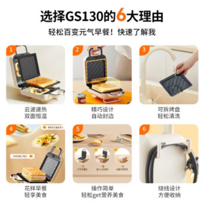 九阳/Joyoung 三明治机GS130单盘早餐机三明治机家用多功能电饼铛一人食双面压烤机烤面包机吐司机 早餐机三明治机家用多功能电饼铛一人食双面压烤机烤面包机吐司机 兑换价格 3500 里程 会员卡别 终身白金卡 白金卡 金卡 银卡 普通卡 儿童卡 服务 由 纳华优选 发货并提供售后 颜色: 米色 购买数量: 件 库存件 配送地址: 立即购买 加入购物车 成功添加到购物车 关闭 购物车共有 种商品 总金额为: 组合销售 产品介绍 产品规格 售后服务 产品咨询 发现好货 苏泊尔(SUPOR)电饼铛家用 双面加热煎饼铛煎烤机三明治机烙饼锅早餐机25mm加深烤盘火力可调JD31A847A 6500 里程 苏泊尔(SUPOR) 电饼铛 自动煎烤机 电火锅多功能 加大加深60mm双加热烙饼 锅面煎饼电饼档 两档火力 JT30A818 5700 里程 苏泊尔(SUPOR)电饼铛家用双面加热电饼档煎烤机烙饼机双面悬浮加热早餐机三明治机JJ30A648-Q 5400 里程 美的(Midea)电饼铛家用智能双面加热煎烤机烙饼机蛋饼机薄饼机煎饼烙饼锅JHN30F 4800 里程 小熊/Bear 八角电烤盘家用无烟电烤炉多功能烤涮电火锅烤肉锅 6500 里程