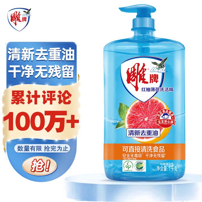 雕牌 清新红柚洗洁精1.03kg 餐洗净蔬果餐具净 去油清新无残留 安全无毒级 红柚清香 强效去重油,易漂无残留,食品用洗洁精。 兑换价格 1100 里程 会员卡别 终身白金卡 白金卡 金卡 银卡 普通卡 儿童卡 服务 由 京狮文化生活馆 发货并提供售后 清洁剂容量: 其他容量 净含量: 其他容量 购买数量: 件 库存件 配送地址: 立即购买 加入购物车 成功添加到购物车 关闭 购物车共有 种商品 总金额为: