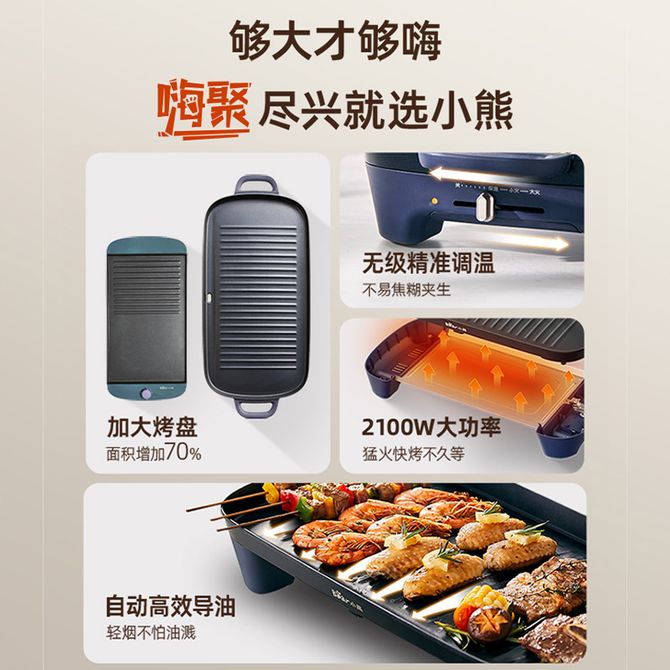 小熊/Bear 电烤炉烤肉盘烤肉锅大烤盘电烤盘烧烤盘家用多功能大容量大功率速烤轻油少烟不粘烤肉机 加大烤盘 2100W大功率 多用途分区设计 兑换价格 8300 里程 会员卡别 终身白金卡 白金卡 金卡 银卡 普通卡 儿童卡 服务 由 广西自贸区京通桂达科技发展有限公司 发货并提供售后 颜色: 其他 购买数量: 件 库存件 配送地址: 立即购买 加入购物车 成功添加到购物车 关闭 购物车共有 种商品 总金额为: 组合销售 产品介绍 产品规格 售后服务 产品咨询 发现好货 苏泊尔(SUPOR)电饼铛家用 双面加热煎饼铛煎烤机三明治机烙饼锅早餐机25mm加深烤盘火力可调JD31A847A 6500 里程 苏泊尔(SUPOR) 电饼铛 自动煎烤机 电火锅多功能 加大加深60mm双加热烙饼 锅面煎饼电饼档 两档火力 JT30A818 5700 里程 苏泊尔(SUPOR)电饼铛家用双面加热电饼档煎烤机烙饼机双面悬浮加热早餐机三明治机JJ30A648-Q 5700 里程 美的(Midea)电饼铛家用智能双面加热煎烤机烙饼机蛋饼机薄饼机煎饼烙饼锅JHN30F 4800 里程 奥克斯 电饼铛家庭用新款双面加热加大尺寸加深烤盘烙饼专用锅自动控温断电煎饼锅早餐机 5200 里程
