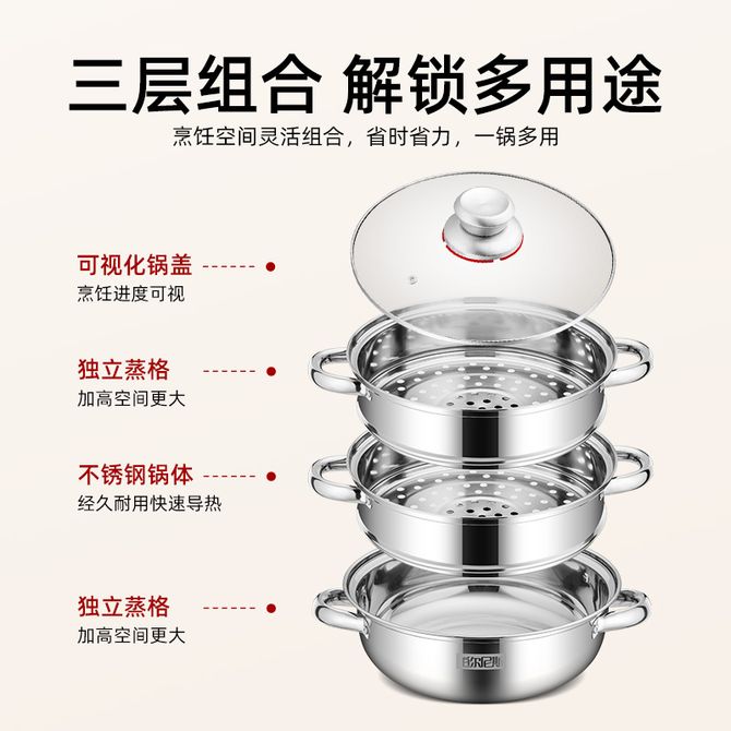 组合销售 产品介绍 产品规格 售后服务 产品咨询 发现好货 德铂(Debo)汤锅不锈钢单层蒸锅蒸笼电磁炉两用锅艾琳诺26cm DEP-DS146 2100 里程 拜格(Bayco) 蒸锅三层家用蒸馒头煲汤加厚汤锅BG1548【28cm】 3000 里程 炊大皇(COOKER KING) 304不锈钢三层蒸锅家用复合底汤锅蒸馒头包子可视可立高拱盖30cm 6100 里程 德铂(Debo) 科洛姆双层蒸锅不锈钢汤锅20cm不挑炉灶DEP-913 2600 里程 拜格(Bayco) 蒸锅28cm加厚多功能家用汤煮锅BG1304 2300 里程