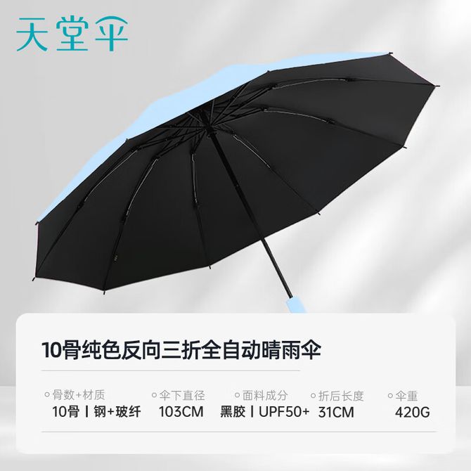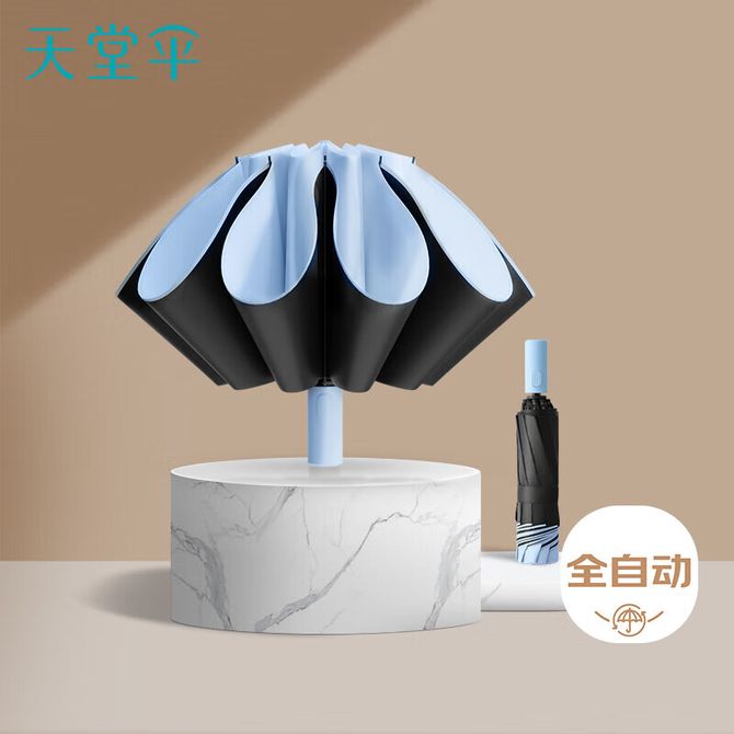 天堂伞 全自动阳伞三折 防晒防紫外线便携折叠反向晴女男 净空蓝 黑胶防晒 反向收伞 晴雨两用 多色可选 拒水伞布 自动系列 兑换价格 4300 里程 会员卡别 终身白金卡 白金卡 金卡 银卡 普通卡 儿童卡 服务 由 陈记严选 发货并提供售后 颜色: 蓝色 购买数量: 件 库存件 配送地址: 立即购买 加入购物车 成功添加到购物车 关闭 购物车共有 种商品 总金额为: 组合销售 产品介绍 产品规格 售后服务 产品咨询 发现好货 天堂伞 加大雨伞三折 晴雨两用商务伞10骨大雨伞男女 30721EJDX岩石蓝 1600 里程 雨景/rainscape 简约十骨大号男士三折雨伞 折叠伞 男女商务晴雨伞65CM*10骨 2200 里程 雨景/rainscape 男士全自动商务雨伞 十骨全自动晴雨伞 折叠商务伞 两用双人超大加固防风三折伞 4400 里程 美度(MAYDU) 三折自动雨伞环扣便挂手柄加固防风简约清新配色反向折叠雨伞 2800 里程 天玮伞业/Tianwei umbrella 雨伞 六折防晒防紫外线太阳伞 迷你便携小巧遮阳伞 1500 里程