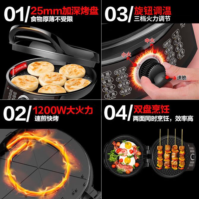 组合销售 产品介绍 产品规格 售后服务 产品咨询 发现好货 苏泊尔(SUPOR)电饼铛家用 双面加热煎饼铛煎烤机三明治机烙饼锅早餐机25mm加深烤盘火力可调JD31A847A 6500 里程 苏泊尔(SUPOR) 电饼铛 自动煎烤机 电火锅多功能 加大加深60mm双加热烙饼 锅面煎饼电饼档 两档火力 JT30A818 5700 里程 苏泊尔(SUPOR)电饼铛家用双面加热电饼档煎烤机烙饼机双面悬浮加热早餐机三明治机JJ30A648-Q 5700 里程 美的(Midea)电饼铛家用智能双面加热煎烤机烙饼机蛋饼机薄饼机煎饼烙饼锅JHN30F 4800 里程 奥克斯 电饼铛家庭用新款双面加热加大尺寸加深烤盘烙饼专用锅自动控温断电煎饼锅早餐机 5200 里程