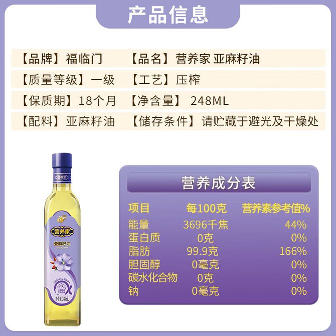 福临门 营养家亚麻籽油248ml 中粮出品 亚麻籽油 兑换价格 1300 里程 会员卡别 终身白金卡 白金卡 金卡 银卡 普通卡 儿童卡 服务 由 全食行 发货并提供售后 油品规格: 248ml 购买数量: 件 库存件 配送地址: 立即购买 加入购物车 成功添加到购物车 关闭 购物车共有 种商品 总金额为: 组合销售 产品介绍 产品规格 售后服务 产品咨询 发现好货 长寿花 金胚玉米油食用油非转基因压榨一级 1.8L 2200 里程 珍佰粮菜籽油5L 5500 里程 福临门 一级大豆油900ML/瓶 优质家用食用油 1100 里程 福临门 家香味食用油 沂蒙土榨 花生仁油900ml 1600 里程 金龙鱼 浓香花生油5L 大桶装物理压榨一级厨房烹饪炒菜植物油粮油家庭食用油 浓香花生油食用油 5000 里程