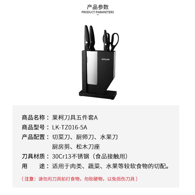 德世朗(DESLON) 正品莱柯刀具五件套A 切菜刀+厨师刀+水果刀+厨房剪+松木刀座五件套LKTZ0165A 锋利刀刃 耐用不易磨损 不锈钢材 易清洗 食品接触用 舒适手感 兑换价格 5700 里程 会员卡别 终身白金卡 白金卡 金卡 银卡 普通卡 儿童卡 服务 由 卓鹏商贸生活馆 发货并提供售后 颜色: 其他 购买数量: 件 库存件 配送地址: 立即购买 加入购物车 成功添加到购物车 关闭 购物车共有 种商品 总金额为:
