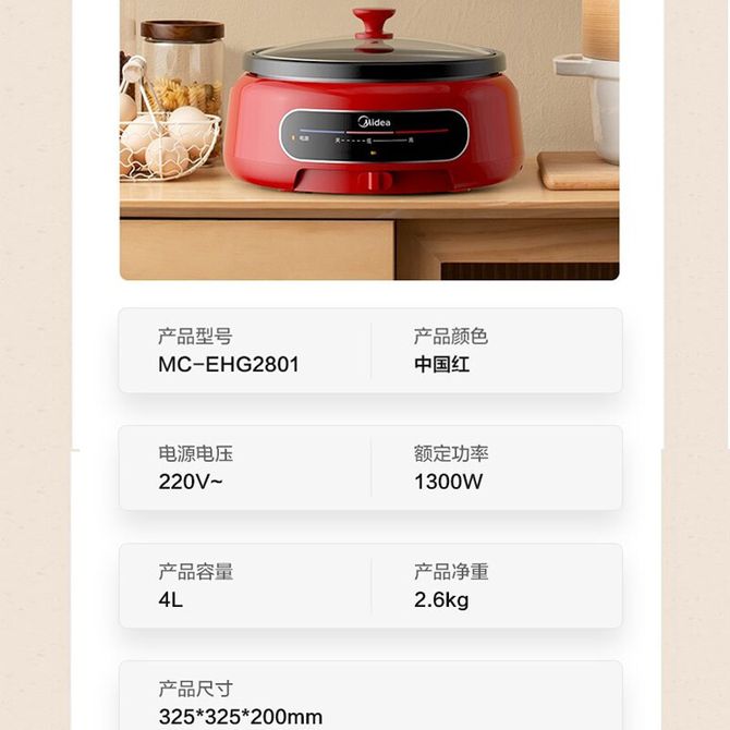 美的/Midea 电火锅多功能锅电热煮锅多用途锅智能防干烧大容量多功能分体 锅身分离,浸泡清洗,一机多用,无级调温,不糊不粘,4L大容量 兑换价格 7800 里程 会员卡别 终身白金卡 白金卡 金卡 银卡 普通卡 儿童卡 服务 由 广西桂福礼供应链管理有限公司 发货并提供售后 颜色: 红色 购买数量: 件 库存件 配送地址: 立即购买 加入购物车 成功添加到购物车 关闭 购物车共有 种商品 总金额为: