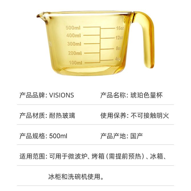 VISIONS 琥珀色量杯500ml 玻璃量杯带刻度厨房家用食品级耐高温烘焙量杯牛奶刻度玻璃杯 耐冷及耐热 易清洗 杯身双刻度 适用烤箱微波炉 兑换价格 2600 里程 会员卡别 终身白金卡 白金卡 金卡 银卡 普通卡 儿童卡 服务 由 广西桂雅文化传媒有限公司 发货并提供售后 颜色: 其他 购买数量: 件 库存件 配送地址: 立即购买 加入购物车 成功添加到购物车 关闭 购物车共有 种商品 总金额为: